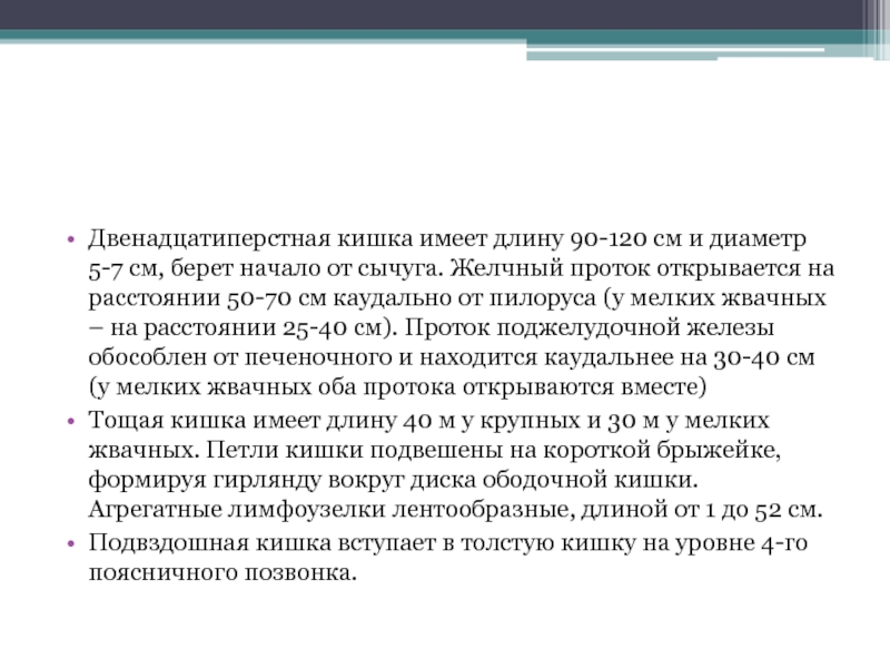 см каудально от пилоруса (у мелких жвачных – на расстоянии 25-40 см). Проток поджелудочной железы обособлен от печеночного и находится каудальнее на 30-40 см (у мелких жвачных оба протока открываются вместе)