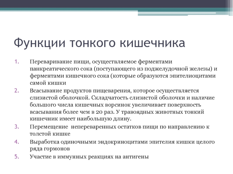 Всасывание продуктов пищеварения, которое осуществляется слизистой оболочкой. Складчатость слизистой оболочки и наличие большого числа кишечных ворсинок увеличивает поверхность всасывания более чем в 20 раз. У травоядных животных тонкий кишечник имеет наибольшую длину.
