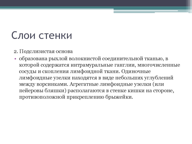 содержатся интрамуральные ганглии, многочисленные сосуды и скопления лимфоидной ткани. Одиночные