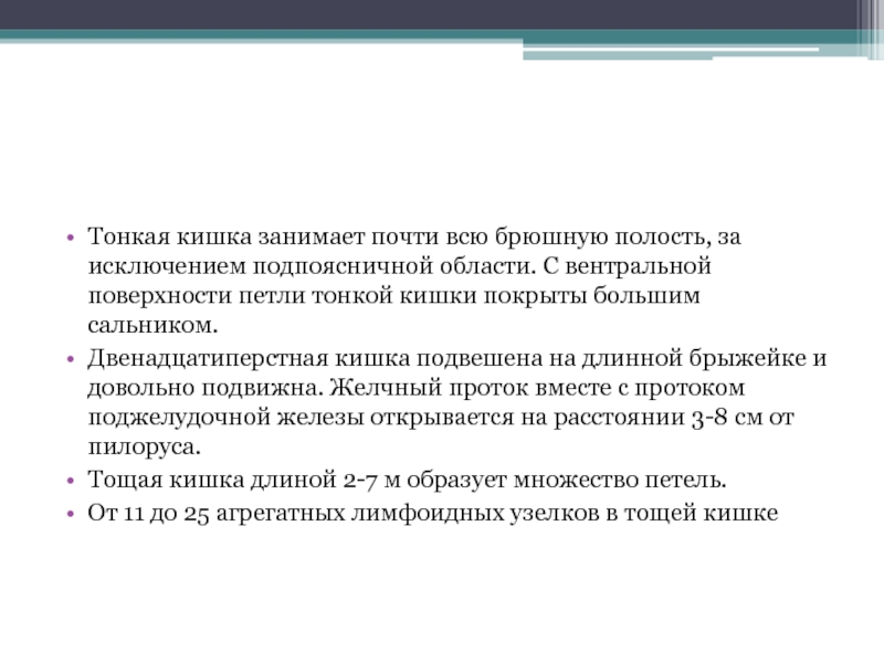 Слайд 21Тонкая кишка занимает почти всю брюшную полость, за исключением подпоясничной