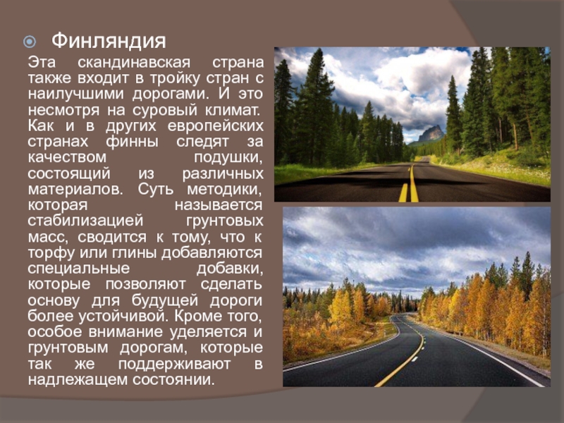 других европейских странах финны следят за качеством подушки, состоящий из различных материалов. Суть методики, которая называется стабилизацией грунтовых масс, сводится к тому, что к торфу или глины добавляются специальные добавки, которые позволяют сделать основу для будущей дороги более устойчивой. Кроме того, особое внимание уделяется и грунтовым дорогам, которые так же поддерживают в надлежащем состоянии.