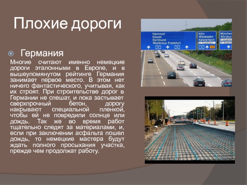 ничего фантастического, учитывая, как их строят. При строительстве дорог в Германии не спешат, и пока застывает сверхпрочный бетон, дорогу накрывают специальной пленкой, чтобы ей не повредили солнце или дождь. Так же во время работ тщательно следят за материалами, и, если при заключении асфальта пошел дождь, то немецкие мастера будут ждать полного просыхания участка, прежде чем продолжат работу.