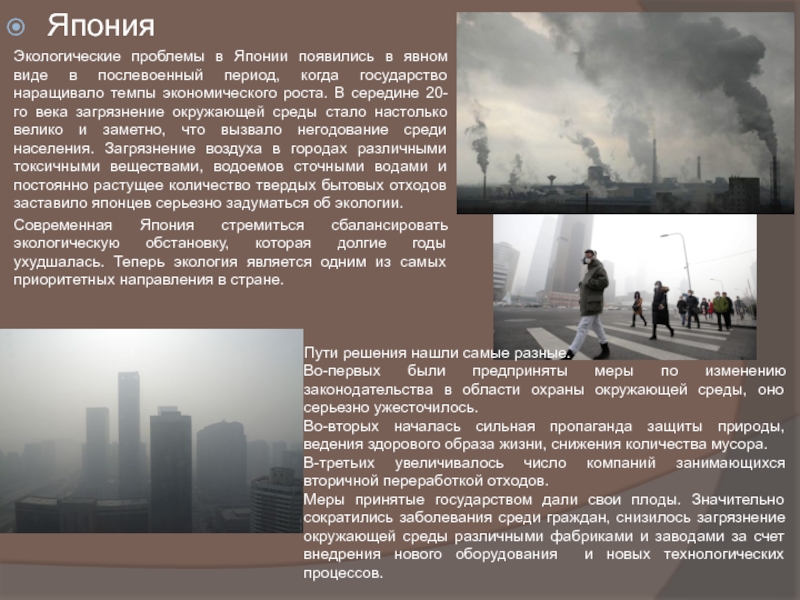 Современная Япония стремиться сбалансировать экологическую обстановку, которая долгие годы ухудшалась. Теперь экология является одним из самых приоритетных направления в стране.