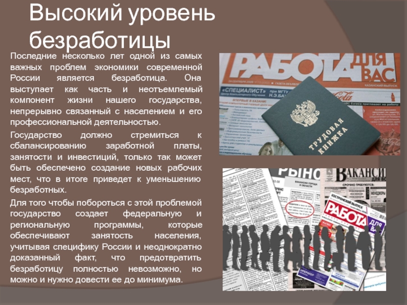 Для того чтобы побороться с этой проблемой государство создает федеральную и региональную программы, которые обеспечивают занятость населения, учитывая специфику России и неоднократно доказанный факт, что предотвратить безработицу полностью невозможно, но можно и нужно довести ее до минимума.