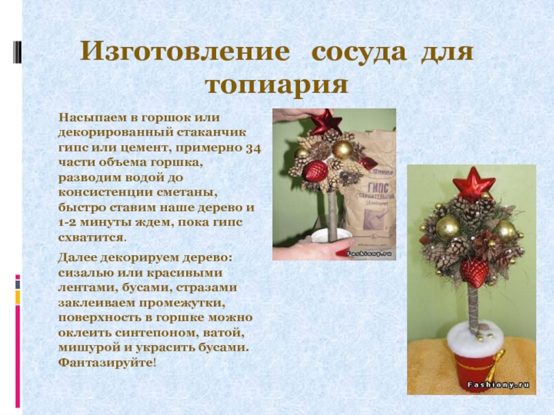 Далее декорируем дерево: сизалью или красивыми лентами, бусами, стразами заклеиваем промежутки, поверхность в горшке можно оклеить синтепоном, ватой, мишурой и украсить бусами. Фантазируйте!