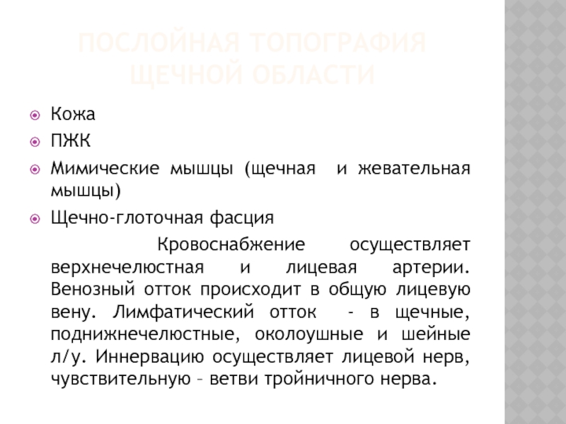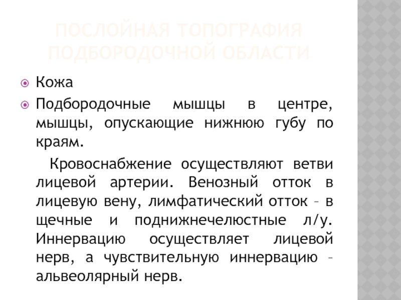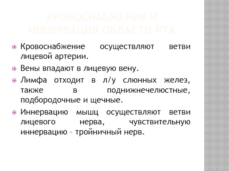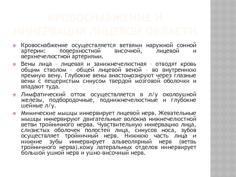в общую лицевую вену. Лимфатический отток - в щечные, поднижнечелюстные, околоушные и шейные л/у. Иннервацию осуществляет лицевой нерв, чувствительную – ветви тройничного нерва.