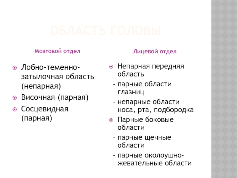 Иннервацию лобной области осуществляет лобный нерв (1 ветвь тройничного нерва – глазничного нерва), лобные и затылочные брюшки иннервирует лицевой нерв. Кожу височной и теменной области – ушно-височный нерв (3 ветвь тройничного нерва – нижнечелюстной). Затылочную область иннервирует малый затылочный нерв шейного сплетения и большой затылочный нерв.