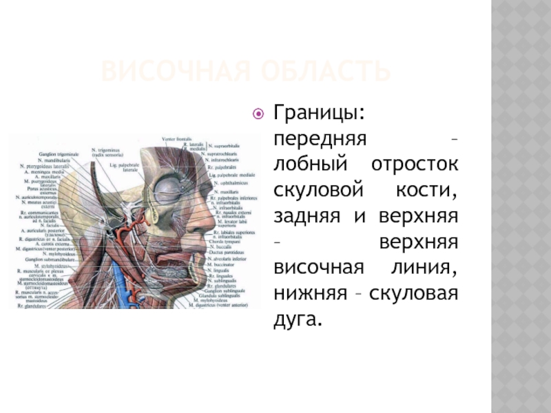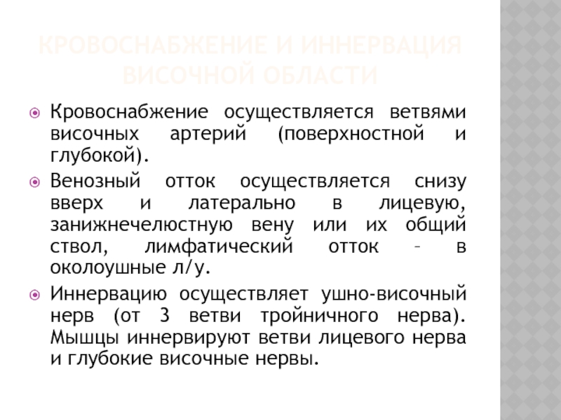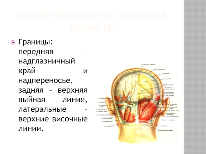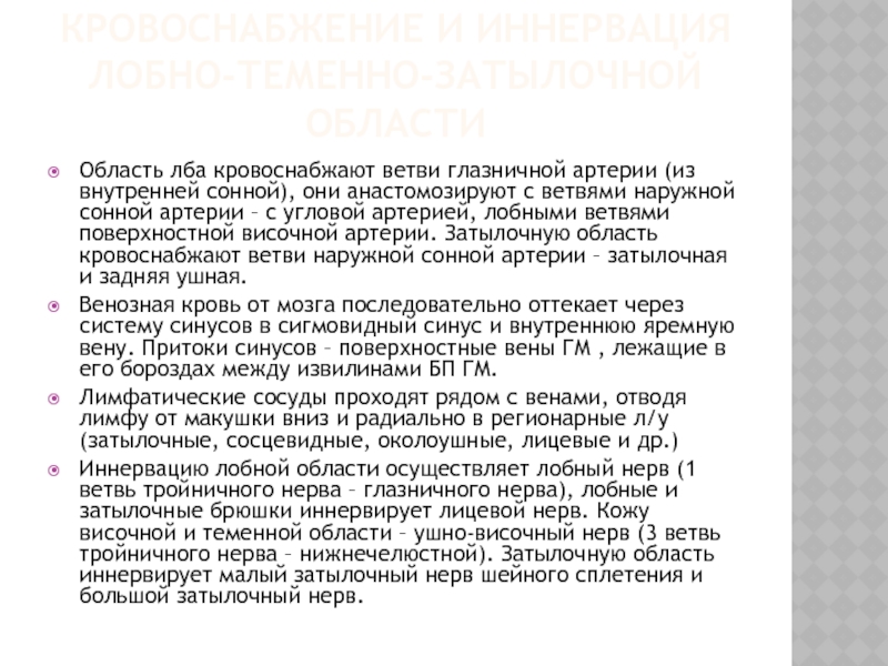 Слайд 7Кровоснабжение и иннервация лобно-теменно-затылочной области