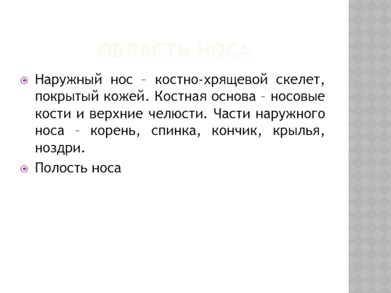 лицевые и глазные вены и в кавернозный синус. Лимфатический отток осуществляется в поднижнечелюстные и околоушные л/у. Иннервацию наружного носа осуществляют чувствительные волокна вторых-третьих ветвей тройничного нерва. Носовую мышцу иннервирует лицевой нерв.