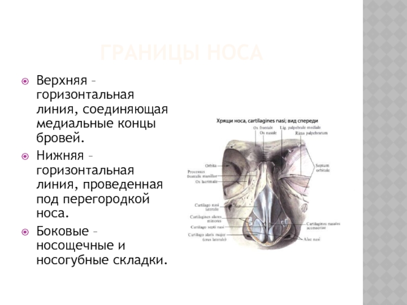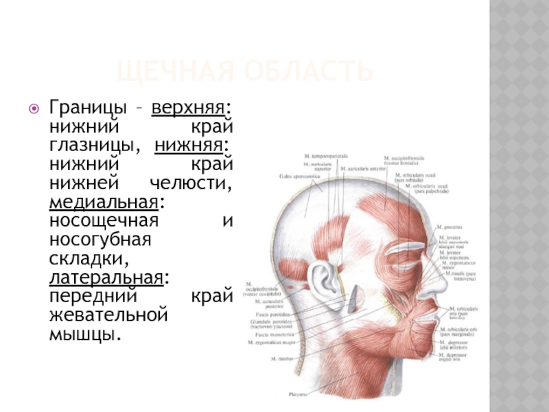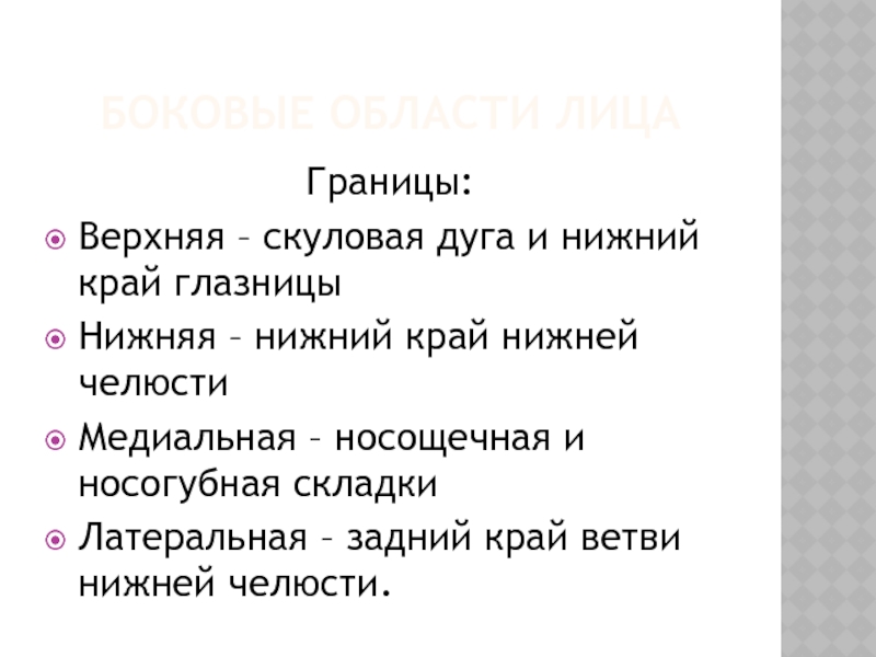 нижней челюсти, медиальная: носощечная и носогубная складки, латеральная: передний край