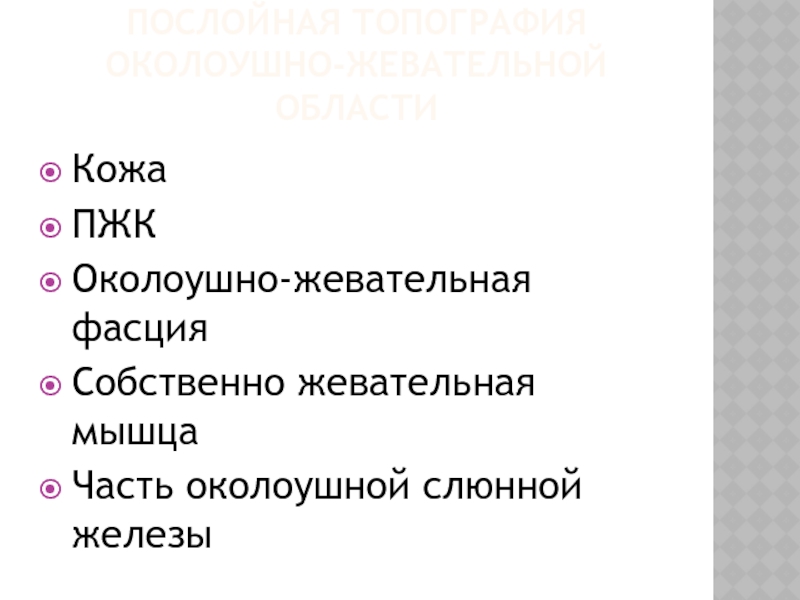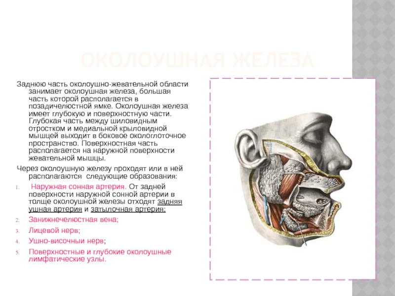 Заднюю часть околоушно-жевательной области занимает околоушная железа, большая часть