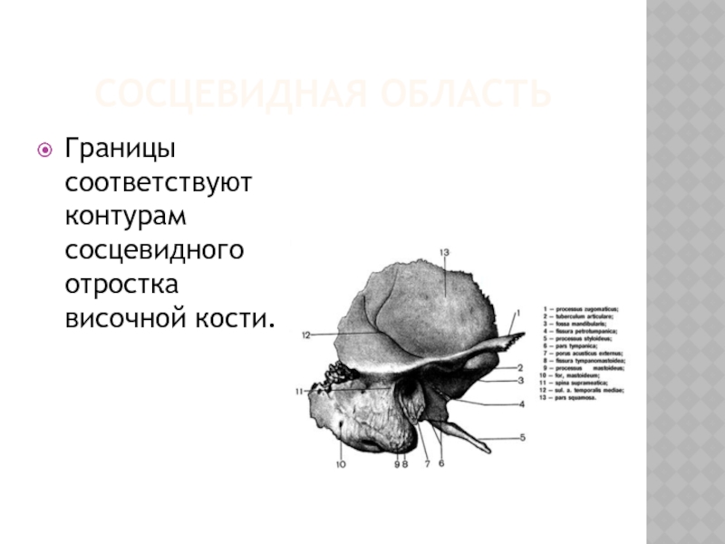 Границы соответствуют контурам сосцевидного отростка височной кости.