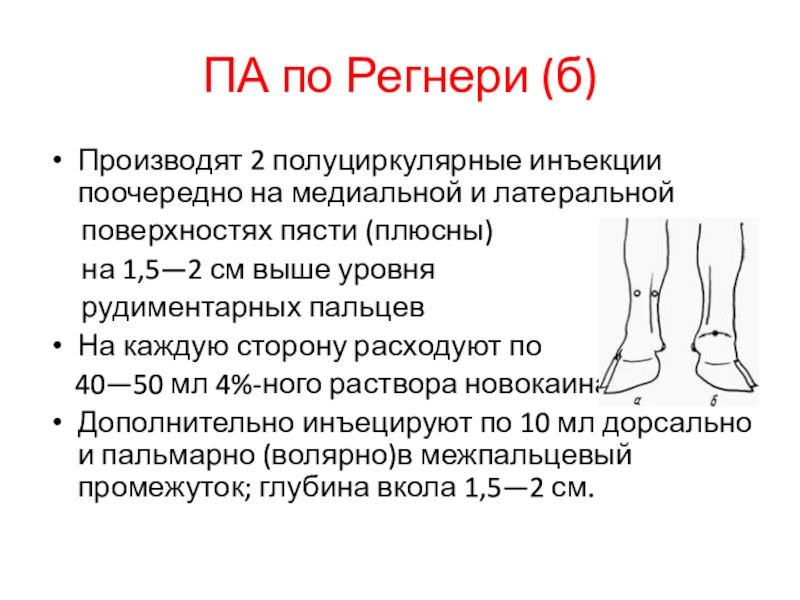 Иглу вкалывают на середине плюсны(пясти) под фасцию на глубину 1—1,5 см. Инъецируют по 20 мл 4—5%-ного раствора новокаина.