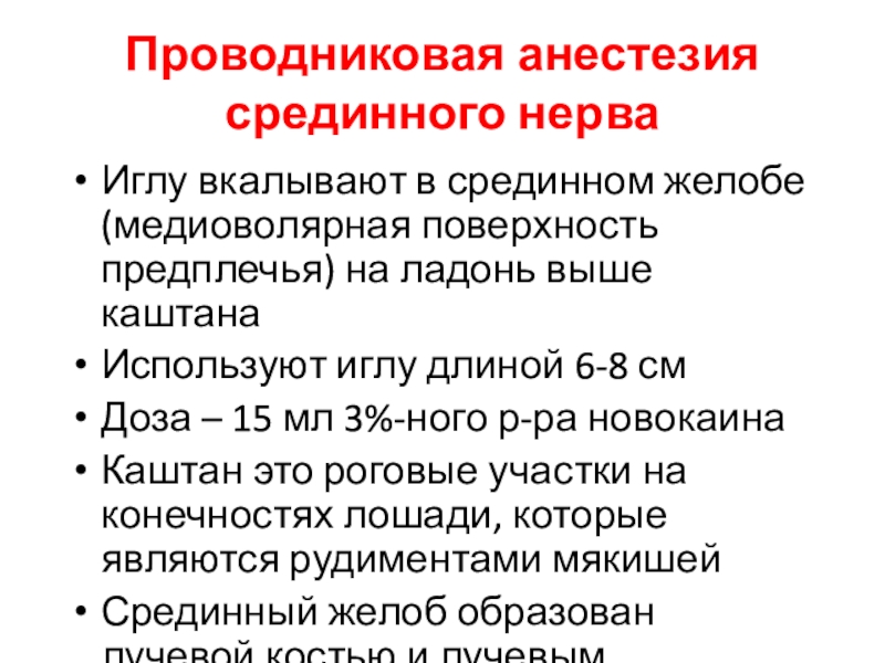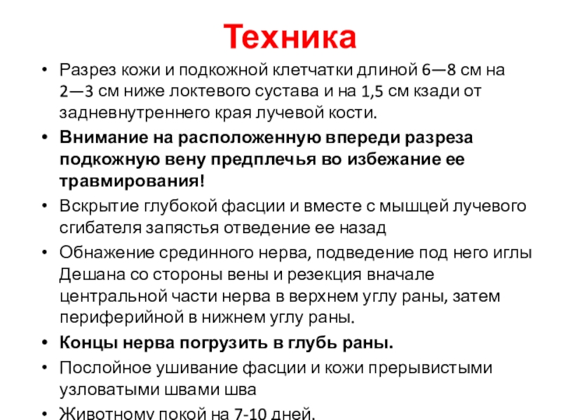Обнажение срединного нерва, подведение под него иглы Дешана со стороны вены и резекция вначале центральной части нерва в верхнем углу раны, затем периферийной в нижнем углу раны.