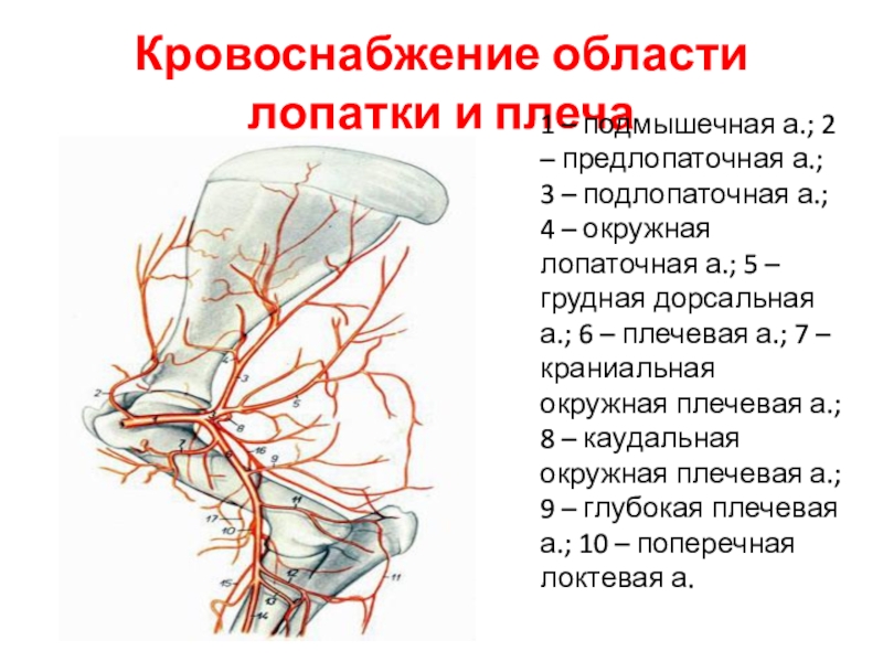 а.; 5 – грудная дорсальная а.; 6 – плечевая а.; 7 – краниальная окружная плечевая а.; 8 – каудальная окружная плечевая а.; 9 – глубокая плечевая а.; 10 – поперечная локтевая а.
