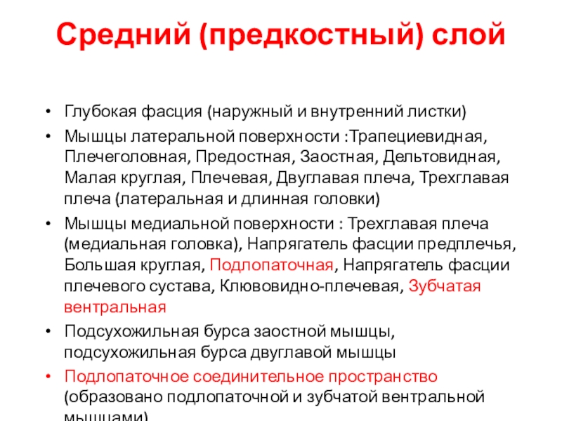 Мышцы медиальной поверхности : Трехглавая плеча (медиальная головка), Напрягатель фасции предплечья, Большая круглая, Подлопаточная, Напрягатель фасции плечевого сустава, Клювовидно-плечевая, Зубчатая вентральная