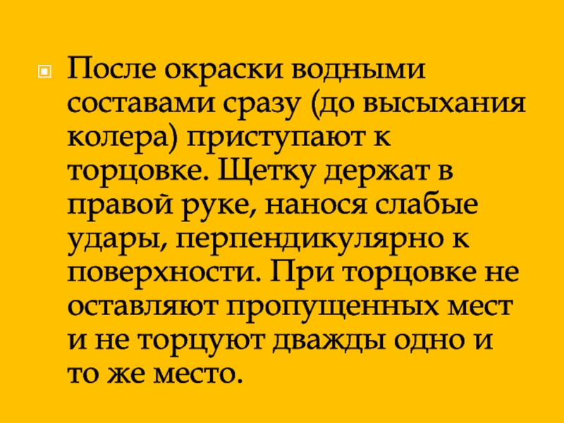 После окраски водными составами сразу (до высыхания колера) приступают к торцовке. Щетку держат в правой руке, нанося