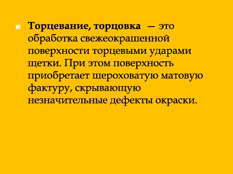 Слайд 2Торцевание, торцовка — это обработка свежеокрашенной поверхности торцевыми ударами щетки.