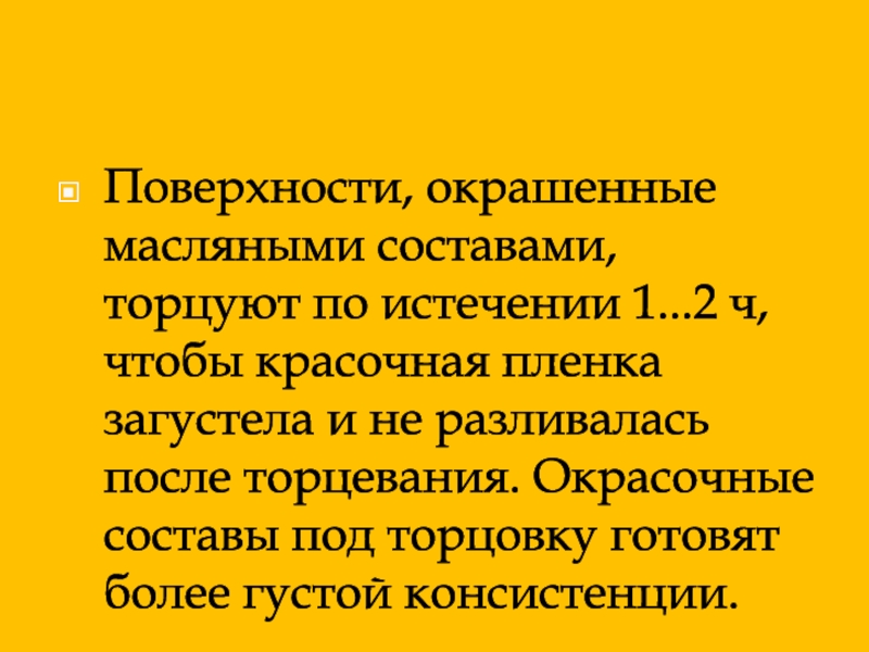 Слайд 6Поверхности, окрашенные масляными составами, торцуют по истечении 1...2 ч, чтобы