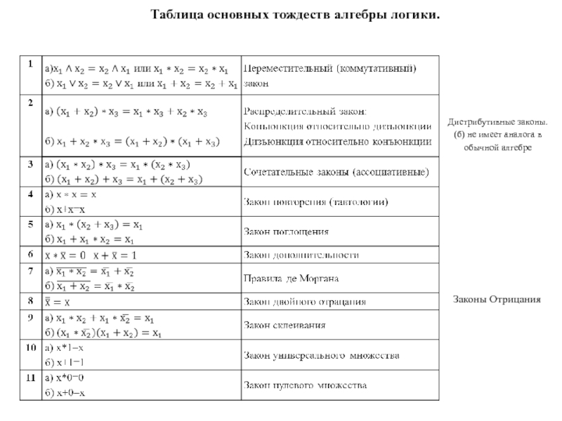 Правила «основных тождеств» алгебры логики.