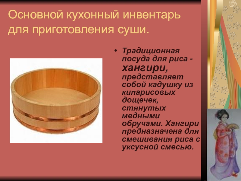хангири, представляет собой кадушку из кипарисовых дощечек, стянутых медными обручами.