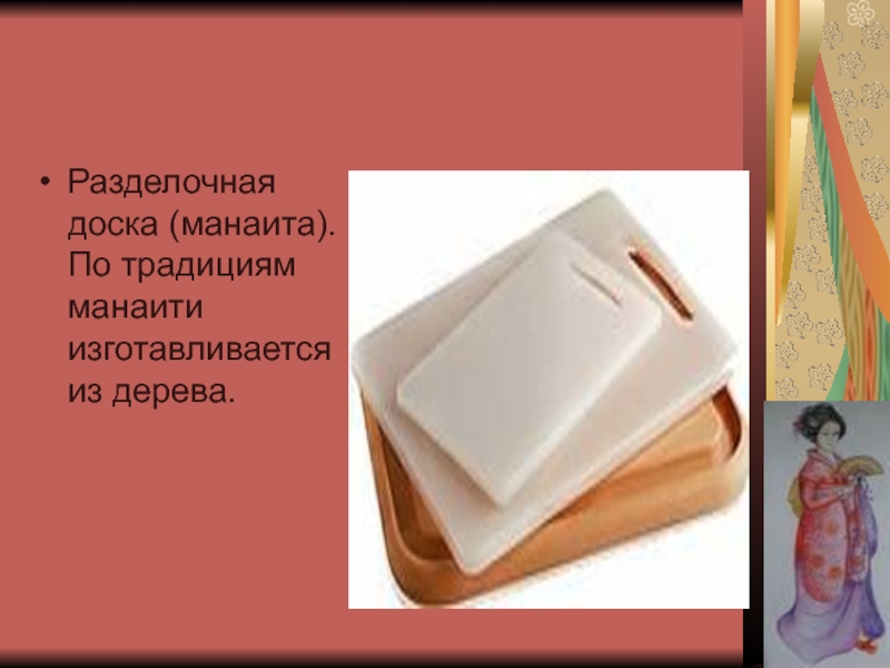 Слайд 20Разделочная доска (манаита). По традициям манаити изготавливается из дерева.