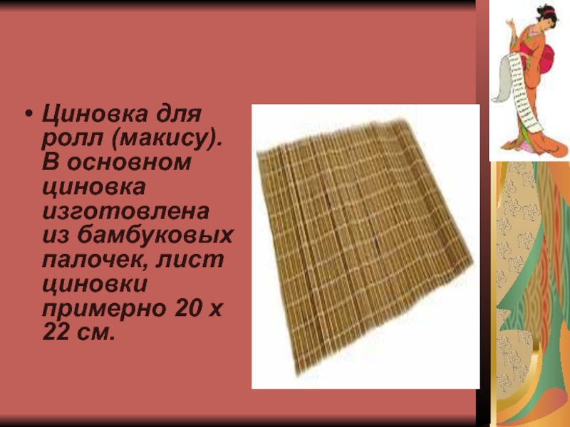 Слайд 21Циновка для ролл (макису). В основном циновка изготовлена из бамбуковых