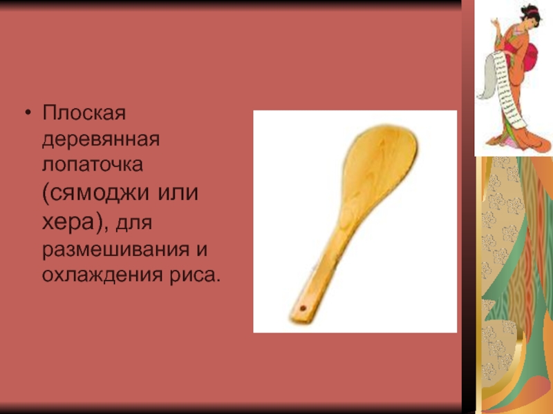 Слайд 17Плоская деревянная лопаточка (сямоджи или хера), для размешивания и охлаждения