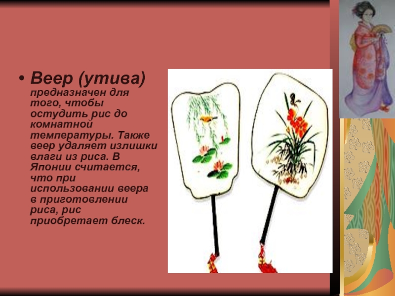 Слайд 18Веер (утива) предназначен для того, чтобы остудить рис до комнатной