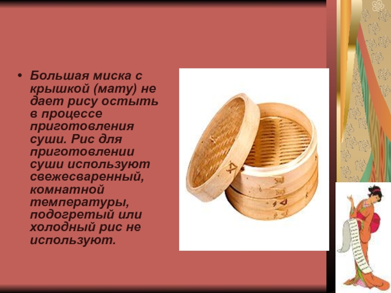 Слайд 19Большая миска с крышкой (мату) не дает рису остыть в