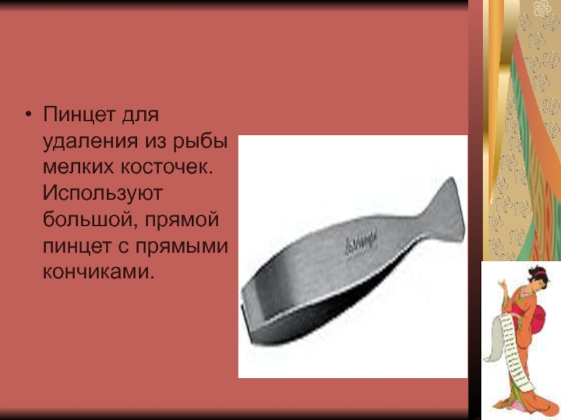 Слайд 23Пинцет для удаления из рыбы мелких косточек. Используют большой, прямой