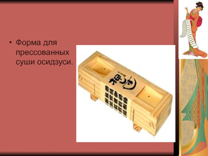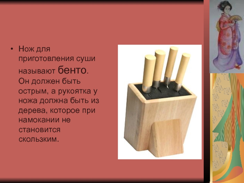 Слайд 22Нож для приготовления суши называют бенто. Он должен быть острым,