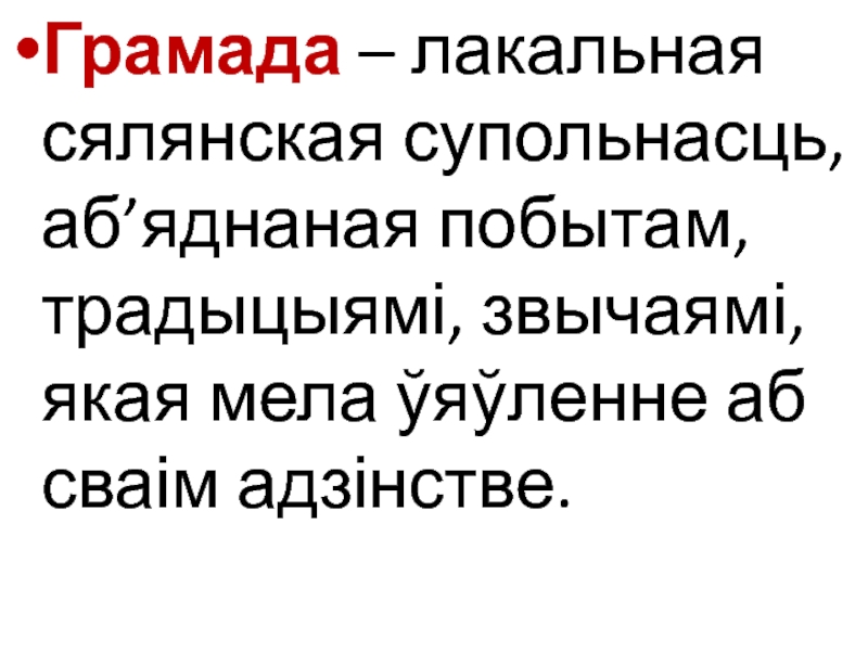 Слайд 16Грамада – лакальная сялянская супольнасць, аб’яднаная побытам, традыцыямі, звычаямі, якая