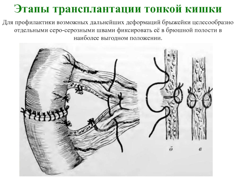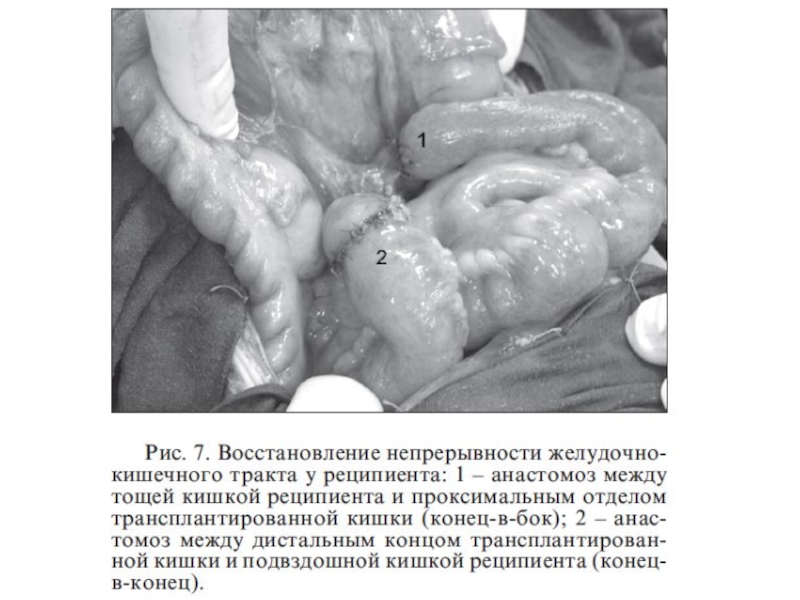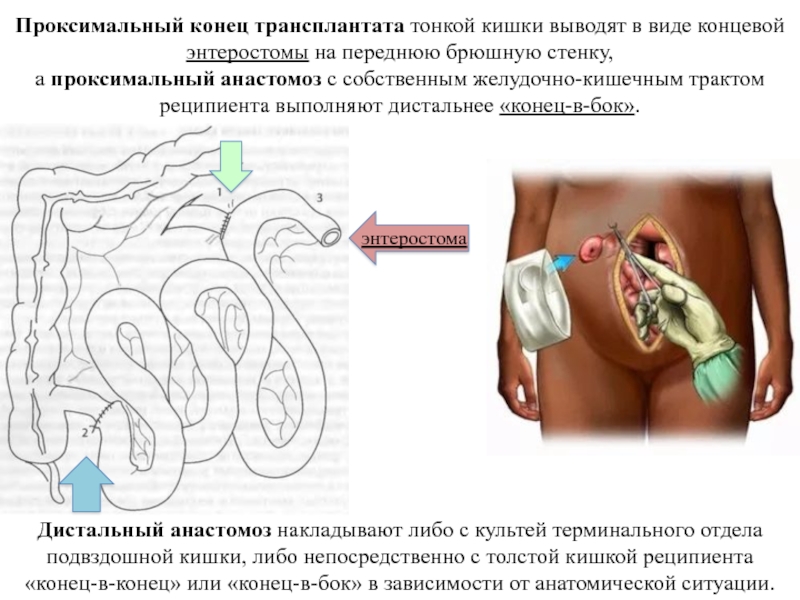 Дистальный анастомоз накладывают либо с культей терминального отдела подвздошной кишки, либо непосредственно с толстой кишкой реципиента «конец-в-конец» или «конец-в-бок» в зависимости от анатомической ситуации.