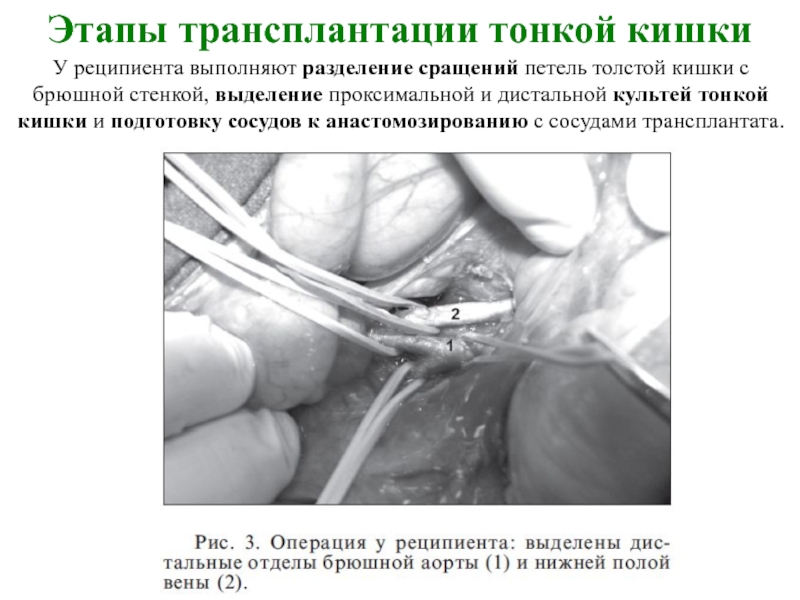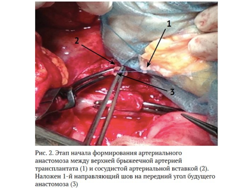 1 - верхнебрыжеечные артерия и вена; 2 - подвздошно-ободочные артерия и вена; 3 - фрагмент подвздошной кишки, выделенный для трансплантации.