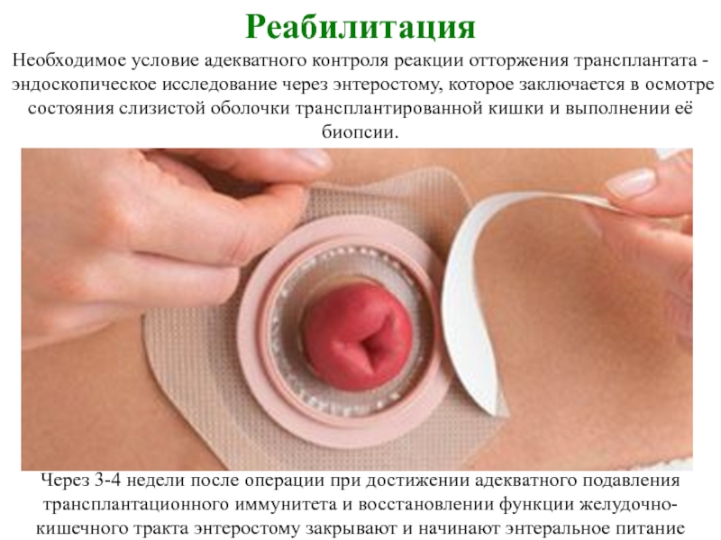 Через 3-4 недели после операции при достижении адекватного подавления трансплантационного иммунитета и восстановлении функции желудочно-кишечного тракта энтеростому закрывают и начинают энтеральное питание