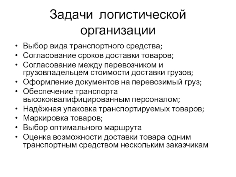 Задачи логистической организацииВыбор вида транспортного средства;Согласование сроков доставки товаров;Согласование между перевозчиком и грузовладельцем стоимости доставки грузов;Оформление документов