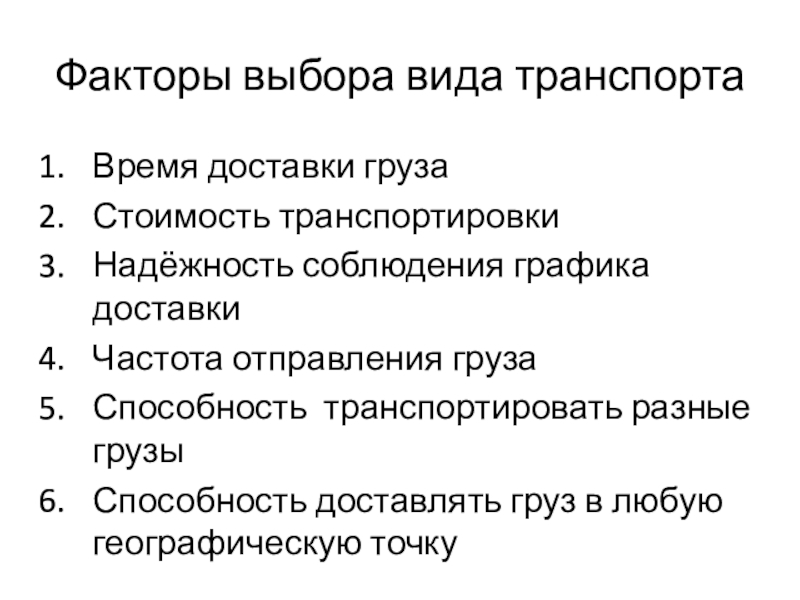 Факторы выбора вида транспортаВремя доставки грузаСтоимость транспортировкиНадёжность соблюдения графика доставкиЧастота отправления грузаСпособность транспортировать разные грузыСпособность доставлять груз