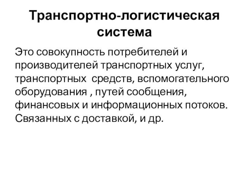 Транспортно-логистическая системаЭто совокупность потребителей и производителей транспортных услуг, транспортных средств, вспомогательного оборудования , путей сообщения, финансовых и