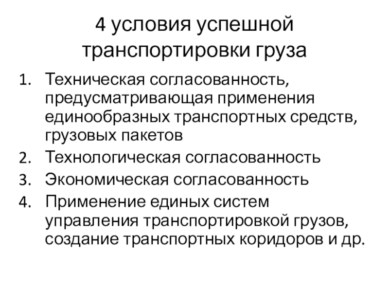 4 условия успешной транспортировки грузаТехническая согласованность, предусматривающая применения единообразных транспортных средств, грузовых пакетовТехнологическая согласованностьЭкономическая согласованностьПрименение единых систем