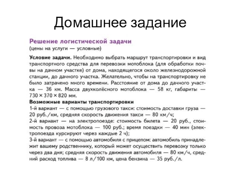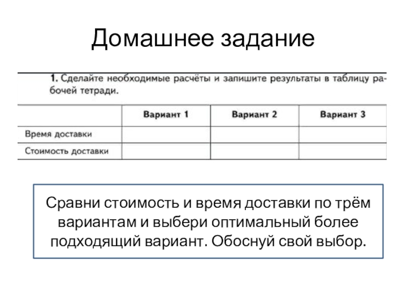 Домашнее заданиеСравни стоимость и время доставки по трём вариантам и выбери оптимальный более подходящий вариант. Обоснуй свой