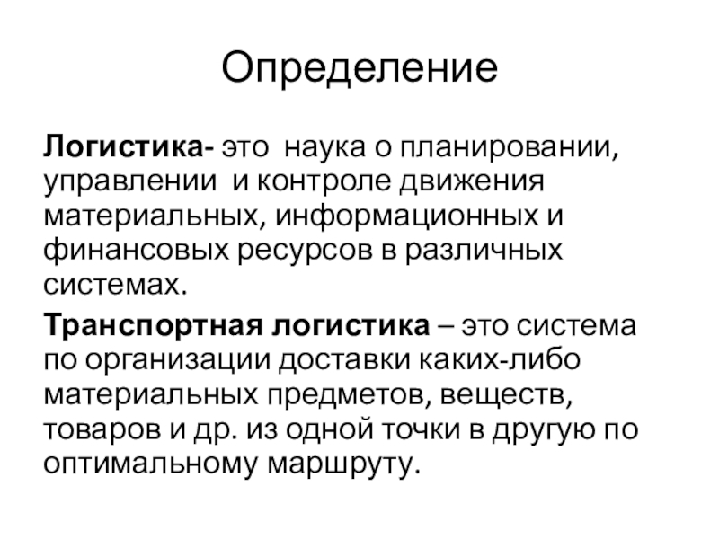 Определение Логистика- это наука о планировании, управлении и контроле движения материальных, информационных и финансовых ресурсов в различных системах.Транспортная логистика – это система по организации доставки каких-либо материальных предметов, веществ, товаров и