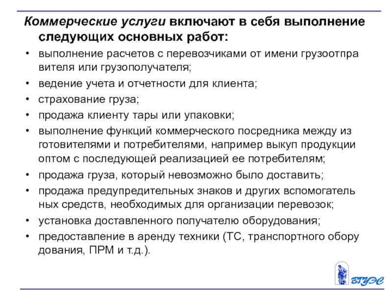 Слайд 19Коммерческие услуги включают в себя выполнение следующих основных работ: