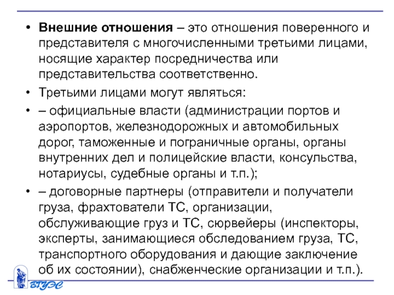 Слайд 10Внешние отношения – это отношения поверенного и представителя с многочисленными