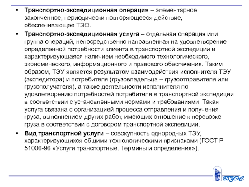 Слайд 7Транспортно-экспедиционная операция – элементарное законченное, периодически повторяющееся действие, обеспечивающее ТЭО.