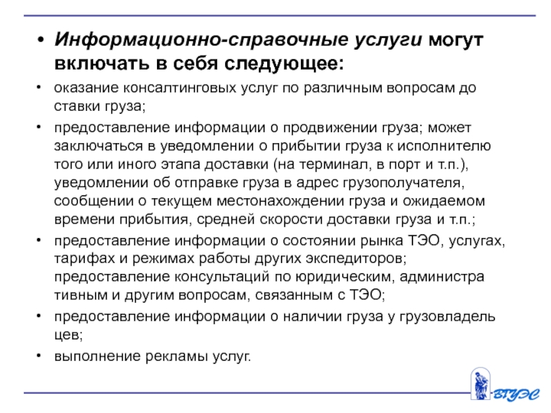 предоставление информации о состоянии рынка ТЭО, услугах, тарифах и режимах работы других экспедиторов; предоставление консультаций по юридическим, административным и другим вопросам, связанным с ТЭО;