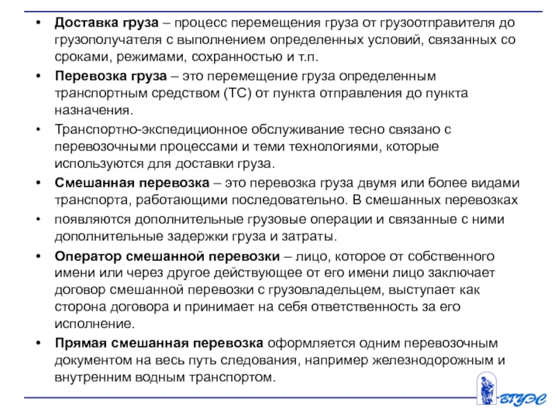 Слайд 4Доставка груза – процесс перемещения груза от грузоотправителя до грузополучателя с