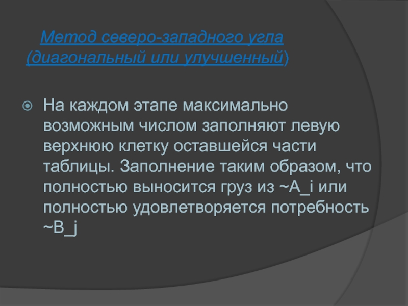 Метод северо-западного угла (диагональный или улучшенный)На каждом этапе максимально возможным числом заполняют левую верхнюю клетку