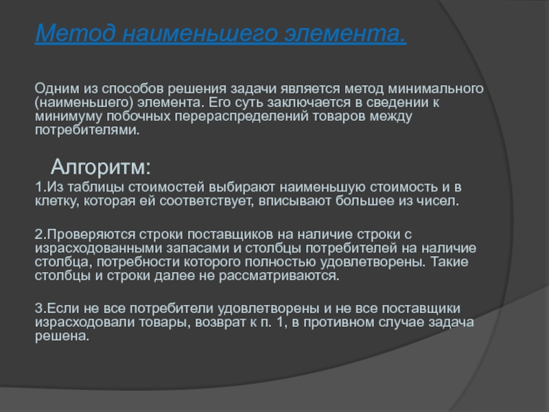 Метод наименьшего элемента.Одним из способов решения задачи является метод минимального (наименьшего) элемента. Его суть заключается в сведении