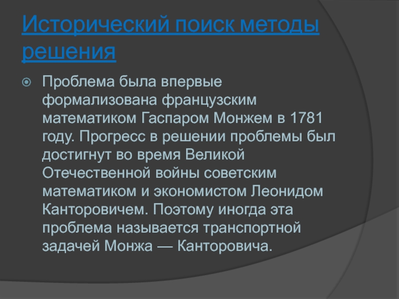 Исторический поиск методы решения Проблема была впервые формализована французским математиком Гаспаром Монжем в 1781 году. Прогресс в